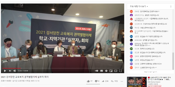 강서양천교육지원청과 양천교육복지센터와 함께 "강서양천 교육복지 권역별 협의체 [실무자]회의"를 유튜브 채널 실시간 방송으로 진행되었습니다. 실시간 방송을 위해 강서마을생활전파소에서 함께 해주셨고, 사람 인 강서마을 김경혜 대표님이 진행을 해주셨습니다. "포스트코로나 시대 교육복지공동체 위기 학생 발굴 및 지원방안"을 주제로 학교 부장교사 및 지역사회교육전문가, 지역기관장 및 실무자로 구성된 패널을 통해 현장의 생생한 이야기를 듣고, 전화 인터뷰와 실시간 댓글 참여로 진행되었습니다.