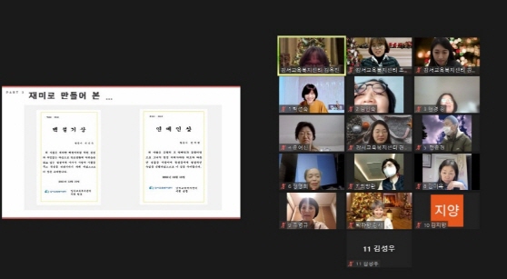 - 일시: 2021. 12. 15(수) 10:00~12:00 - 방법: 코로나바이러스 19로 인하여 비대면 회의로 진행(줌 링크접속) - 대상: "한 아이 맞춤성장 지원 사업" 교육복지 활동가, 강서교육복지센터 실무자 - 내용: "한 아이 맞춤성장 지원 사업" 성과보고, 우수활동가 시상, 기타논의 등
