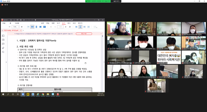 -일시: 2021. 12. 15.(수) 14:00~16:30 -장소: 온라인 -참석자: 가양지역교육복지공동체 지역사회교육전문가, 교육복지 담당교사 및 실무자 총 17명 -내용 1. 교육복지 지역기반형 사업 및 지역공동사업 결과 공유 2. 슈퍼비전: 코로나 블루에서 레드로 위기를 겪고 있는 아동청소년 대처방안(강사: 건국대학교 겸임강사 이은주)
