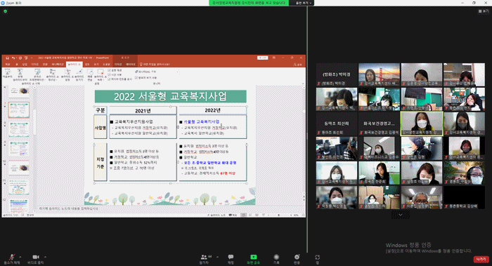 2022년 서울형 교육복지사업을 시작하면서 온라인 연수가 진행되었습니다. 강서교육복지센터 사업과 이용방법에 대해 안내드리고 강서양천교육지원청 교육복지조정자님께서 올해 사업에 대해서 설명해주셨습니다.