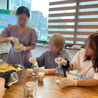 1) 레몬청 만들기 활동 이쁘게 잘린 레몬 슬라이스를 골라 유리용기 벽면에 붙이는 작업을 통해 상품가치 있는 수제청 개발 방법을 배우고 왔습니다.
