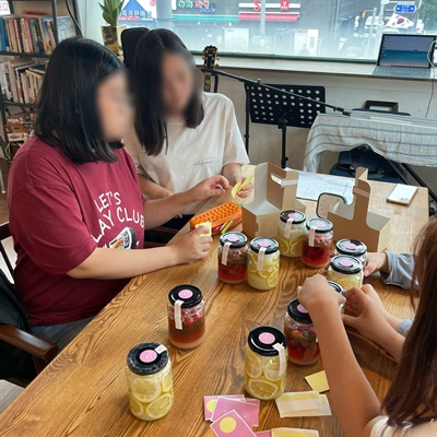 -일시 : 2023.8.12.(토) 11:00~17:00 -장소 : 라온트리 수제청 공방 -참석자: 구띠 동아리 참여학생 4명, 지도교사 1명 -내용: 수제청 공방 탐방 (레몬청·토마토바질청 만들기 체험활동, 수제청 창업자 인터뷰)
