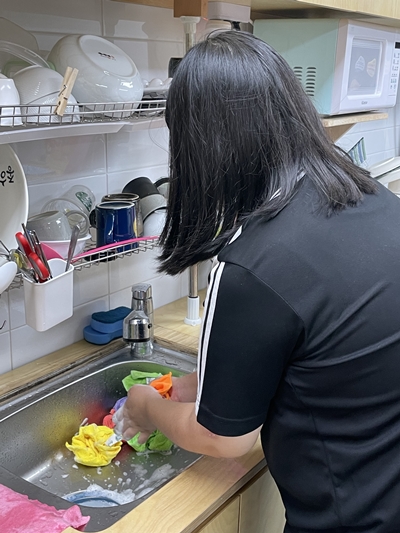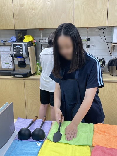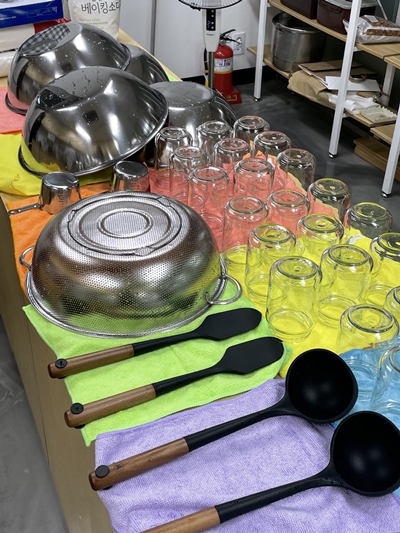 구띠 동아리 친구들이 정성스레 닦아 놓은 조리도구는 행주 위에 올려놓고 건조시켰어요~ (검수 과정에서 무지갯빛 행주를 가장 마음에 들어하던 구띠 친구들^-^)