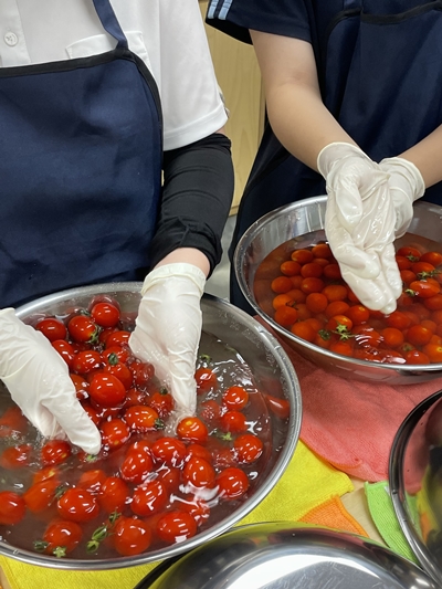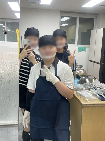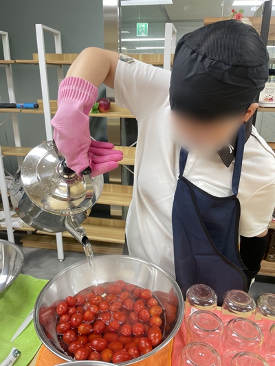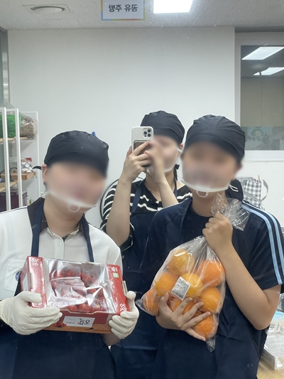 세척 물기가 사라질 동안~ 본격적인 수제청 개발 작업을 위해 두건, 위생 장갑, 위생 마스크를 착용했습니다 조리 과정 시 위생 관리와 청결 관리를 철저히 신경 쓰며 개발 활동에 집중했습니다!