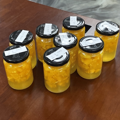 열탕소독 후 식혀둔 유리용기에 오렌지청을 담고 첨가 비율에 따라 유리용기 뚜껑에 라벨링 작업을 합니다~