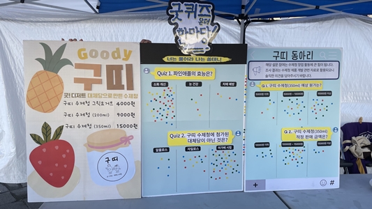 파인애플의 효능과 구띠 수제청에 첨가된 대체당의 종류를 안내할 수 있도록 설문 포스터를 준비하여 설문을 진행했습니다!