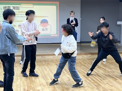 1) 생존 게임 청각 · 촉각 반응 게임을 통해 신체 감각을 느끼고 경직된 몸의 움직임을 완화하는 워밍 업 활동 ( 참여학생이 직접 수립한 프로그램 규칙을 숙지하며 적극적인 참여 태도를 함양하는 시간을 가졌습니다. )
